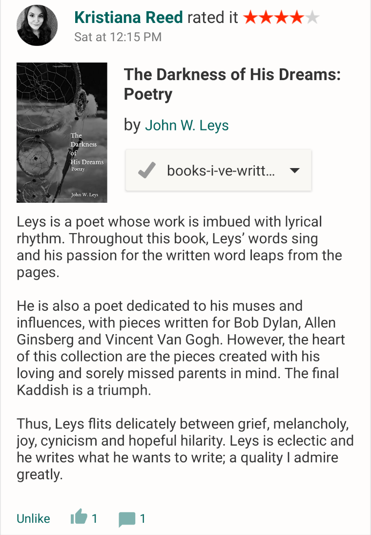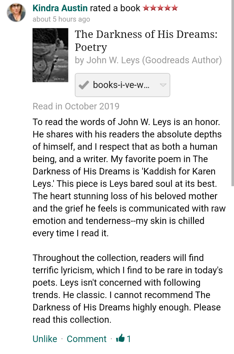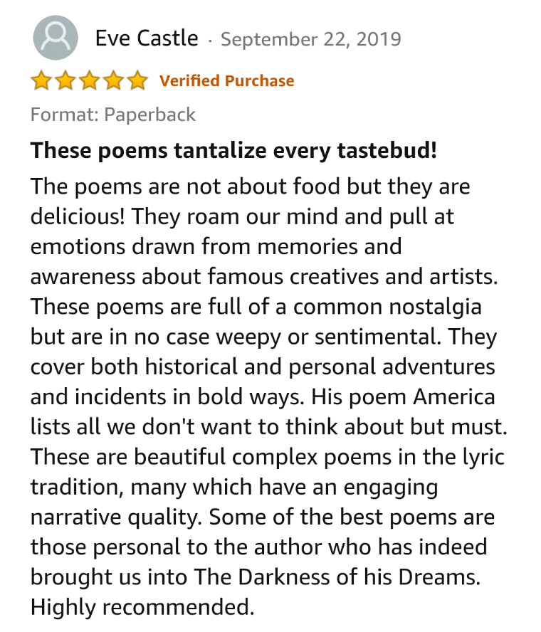 I just wanted to share some of the great reviews I’ve been receiving for my first poetry collection, The Darkness of His Dreams, which is available on Amazon.
